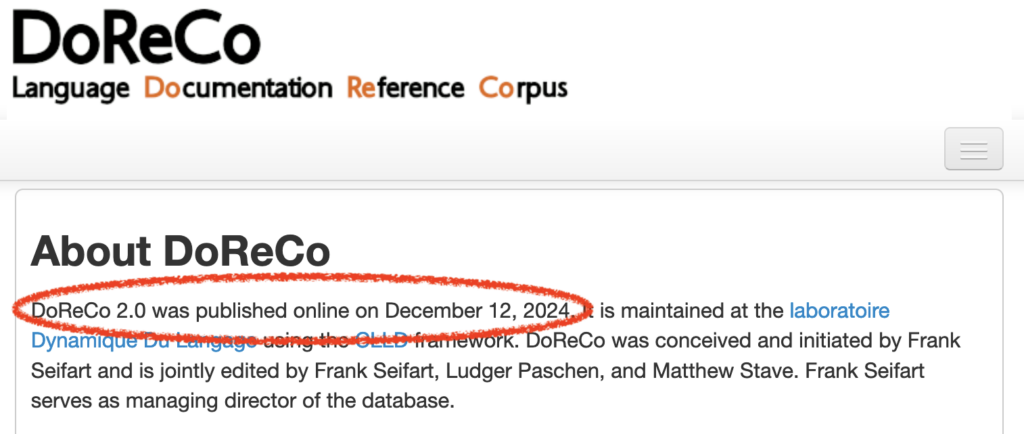 With this release, we have also streamlined the governance of the DoReCo database, with Frank Seifart now serving as managing director in addition to editor. We continue to proudly include Ludger Paschen and Matt Stave as co-editors in recognition of their essential role in implementing the project plan as PostDocs in the DoReCo project from 2019 to 2022.